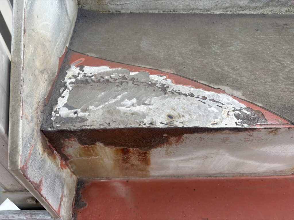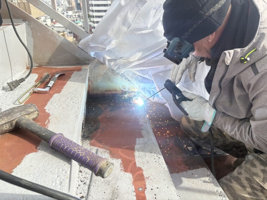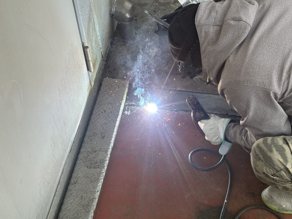 ケレンによって穴が空いてしまった部分は穴の形状に合わせ鉄板を加工し、溶接していきます。