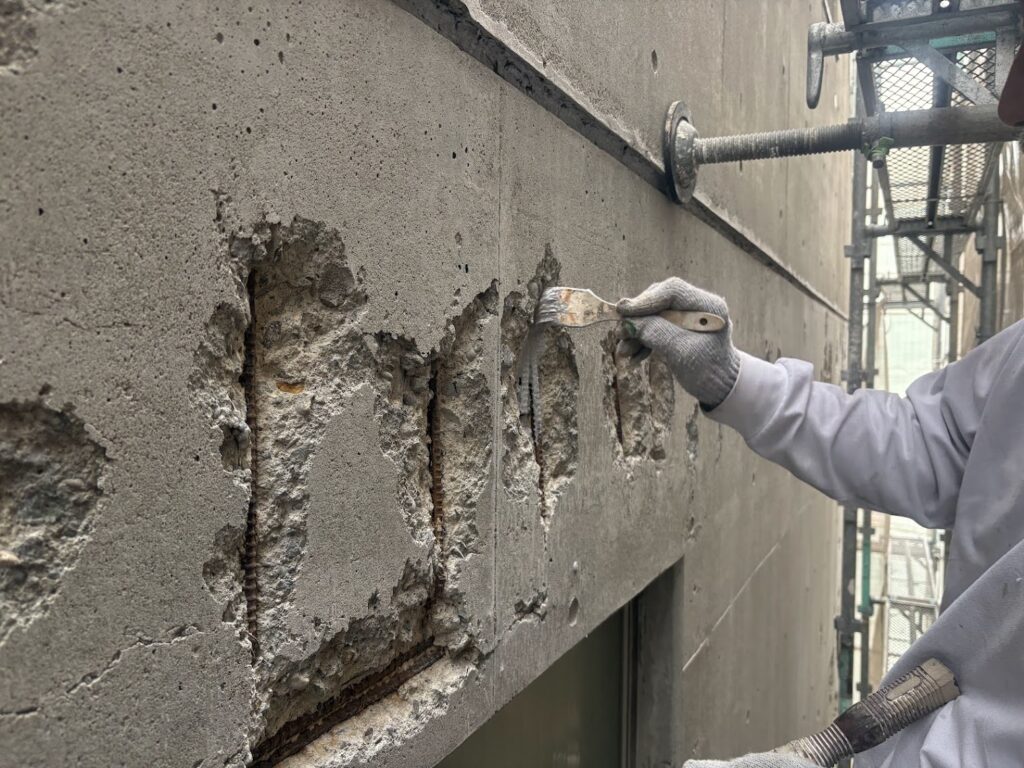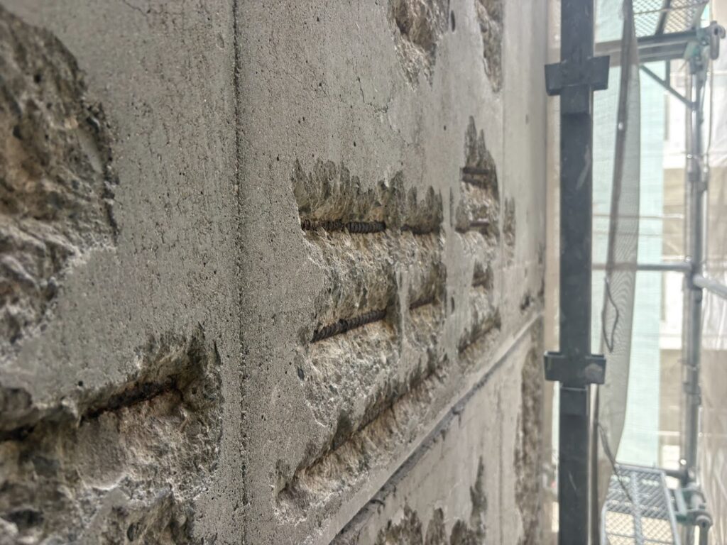 新築時の塗膜とシーリング材の寿命が過ぎてかなりの年月が経過してしまったことから、コンクリート表面の塗膜とシーリングの劣化状況から雨水がコンクリート内部に浸透し、内部鉄筋が錆びることで爆裂を誘発してしまったことが伺えます。