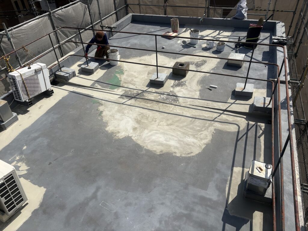 上記事項はお施主様との相談の上、隣地の目立たない部分の打ち放しコンクリートパターン描きを辞め、この予算を屋上の下地処理に充てさせて頂くこととなりました。