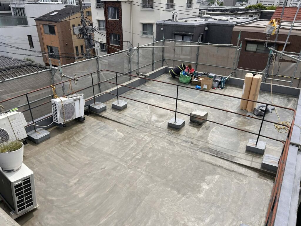 ベランダなどの小さな部分では下地をよく乾燥させることで防水材を流しても不具合を防ぐことが出来ますが、屋上などの広い面積では完全に乾燥させることが困難で、地震などの揺れによって亀裂が生じたりしてしまうため密着工法では大きなリスクがあります。