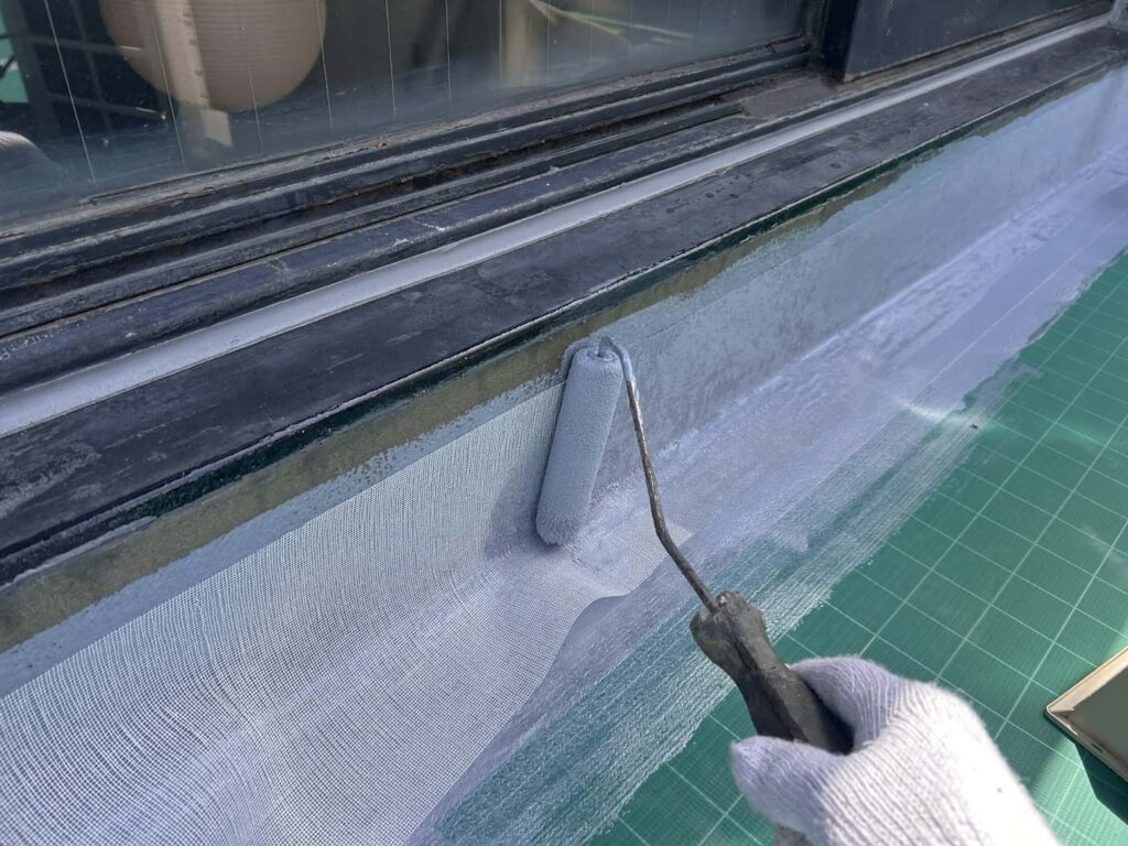 尚、10年保証の施工品質を担保できるよう、切れやすい入隅にはシーリング処理、立上りや、改修用ドレン廻りには補強布(メッシュ)をいれながら防水材を塗布していきます。