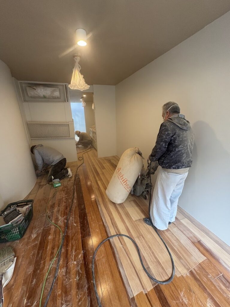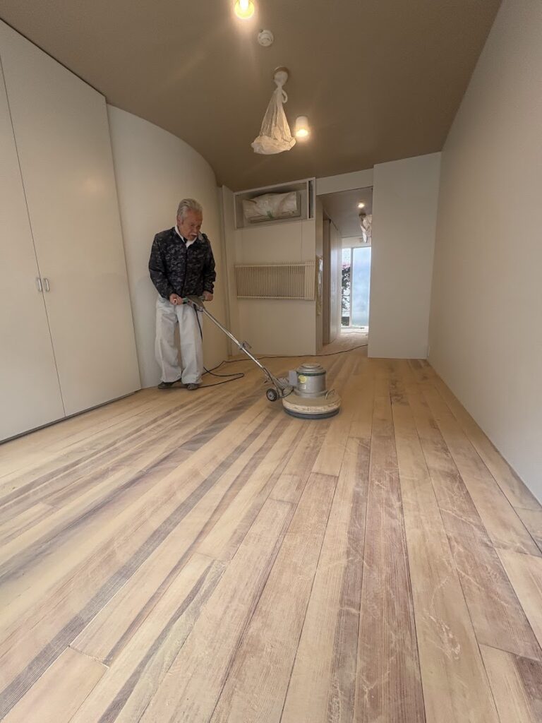 管理会社様よりデザイナーズマンションの無垢フローリング再生のご用命を承りサンディング開始です。