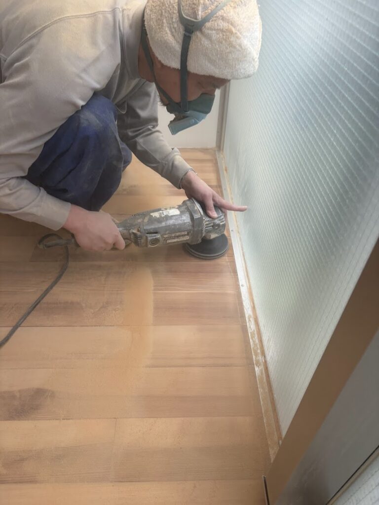 いつものごとくフロアーサンダーにて粗目のサンドペーパーで0.5mm程度研磨し、細かいキズとシミを落としていきます。