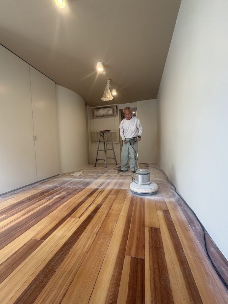 1日目に付着性と研磨性の優れた水性ウレタンクリアーのベースコートを2回塗り、1回毎に木肌を整えるための#180の番手のサンドペーパーでポリッシャーを掛け、十分に木肌を整えました。