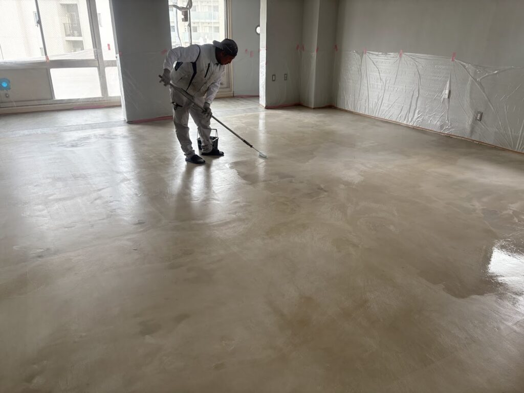 本日は他の業者様が施工した床が粉っぽいということで、ナノテクノロジーによる特許技術で、下地の奥深くまで浸透し、表層を固めることのできるプライマーで固めモルタルの風合いはそのまま生地仕上げを行いました。